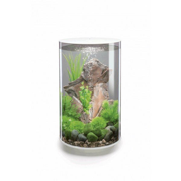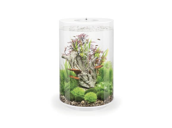 Akvárium biOrb TUBE v bílém provedení s objemem 30 l, LED osvětlením a netradičním válcovým designem umožňující 360° pohled na dekorace či ryby uvnitř akvária. Válcové akvárium s barevnými částmi nahoře a dole, umístěnými tak, aby nezamezovali v 360° pohledu na vegetaci v akváriu. Je vyrobeno z lehkého, dokonale průhledného, ale přesto vysoce odolného akrylátu. 360° pohled je doplněn klasickým LED osvětlením, zážitek je tak tedy ještě umocněn. O čistotu vody se stará patentovaný filtrační systém OASE, který zabezpečí křišťálově čistou vodu bez nějaké námahy. Filtrační houba je umístěna ve spodní části akvária, nečistoty tak přirozeně padají dolů. Zároveň jim k tomu dopomáhá i speciálně navržený systém, který tlačí vodu do kruhu a ta veškeré nečistoty sbírá a následně zanechává ve filtrační houbě. Z té je následně čistá voda okysličena a poslána provzdušňovací trubicí přímo středem akvária nahoru.
