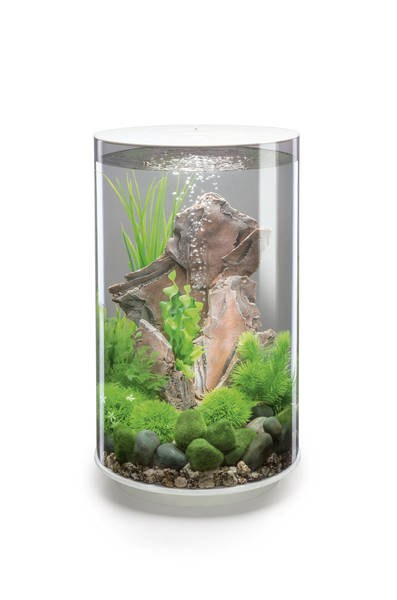 Akvárium v bílé barvě s vícebarevným LED osvětlením a netradičním válcovým designem umožňující 360° pohled na dekorace či ryby uvnitř akvária. Válcové akvárium s barevnými částmi nahoře a dole, umístěnými tak, aby nezamezovali v 360° pohledu na vegetaci v akváriu. Je vyrobeno z lehkého, dokonale průhledného, ale přesto vysoce odolného akrylátu. 360° pohled je doplněn klasickým LED osvětlením, zážitek je tak tedy ještě umocněn. O čistotu vody se stará patentovaný filtrační systém OASE, který zabezpečí křišťálově čistou vodu bez nějaké námahy. Filtrační houba je umístěna ve spodní části akvária, nečistoty tak přirozeně padají dolů. Zároveň jim k tomu dopomáhá i speciálně navržený systém, který tlačí vodu do kruhu a ta veškeré nečistoty sbírá a následně zanechává ve filtrační houbě. Z té je následně čistá voda okysličena a poslána provzdušňovací trubicí přímo středem akvária nahoru.