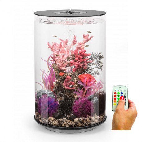 Akvárium biOrb TUBE v černé barvě s netradičním válcovým designem umožňující 360° pohled na dekorace či ryby uvnitř akvária s vícebarevným MCR osvětlením. Válcové akvárium s barevnými částmi nahoře a dole, umístěnými tak, aby nezamezovali v 360° pohledu na vegetaci v akváriu. Je vyrobeno z lehkého, dokonale průhledného, ale přesto vysoce odolného akrylátu. 360° pohled je doplněn klasickým MCR osvětlením, zážitek je tak tedy ještě umocněn. O čistotu vody se stará patentovaný filtrační systém OASE, který zabezpečí křišťálově čistou vodu bez nějaké námahy. Filtrační houba je umístěna ve spodní části akvária, nečistoty tak přirozeně padají dolů. Zároveň jim k tomu dopomáhá i speciálně navržený systém, který tlačí vodu do kruhu a ta veškeré nečistoty sbírá a následně zanechává ve filtrační houbě. Z té je následně čistá voda okysličena a poslána provzdušňovací trubicí přímo středem akvária nahoru.