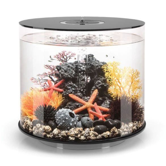 Akvárium biOrb TUBE v černé barvě s netradičním válcovým designem umožňující 360° pohled na dekorace či ryby uvnitř akvária a vícebarevným LED osvětlením. Válcové akvárium s barevnými částmi nahoře a dole, umístěnými tak, aby nezamezovali v 360° pohledu na vegetaci v akváriu. Je vyrobeno z lehkého, dokonale průhledného, ale přesto vysoce odolného akrylátu. 360° pohled je doplněn klasickým LED osvětlením, zážitek je tak tedy ještě umocněn. O čistotu vody se stará patentovaný filtrační systém OASE, který zabezpečí křišťálově čistou vodu bez nějaké námahy. Filtrační houba je umístěna ve spodní části akvária, nečistoty tak přirozeně padají dolů. Zároveň jim k tomu dopomáhá i speciálně navržený systém, který tlačí vodu do kruhu a ta veškeré nečistoty sbírá a následně zanechává ve filtrační houbě. Z té je následně čistá voda okysličena a poslána provzdušňovací trubicí přímo středem akvária nahoru.
