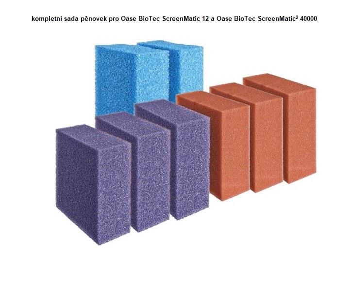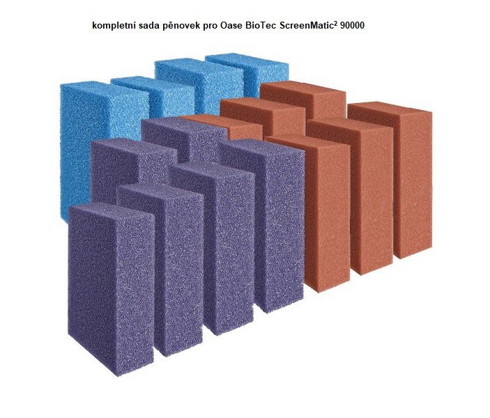 Pro filtr Oase BioTec ScreenMatic 12 a Oase BioTec ScreenMatic2 40000: se skládá z 1 sady modrých pěnovek (kat.č. 42895) a 3 sad pěnovek červená/fialová (kat.č. 42893)