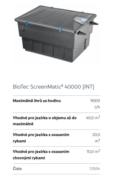 Upřesnění parametrů pro Oase BioTec ScreenMatic2 40000 (průtokový filtr na 10m3)