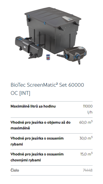 - Kompletní sada obsahuje: průtokový filtr BioTec ScreenMatic² 60000 se samočisticím UVC předčisticím zařízením UVC Bitron C 55W a energeticky účinné filtrační čerpadlo AquaMax Eco Premium 17000. Včetně spouštěče filtrace Oase BioKick k prvotnímu osídlení mikroorganismy.