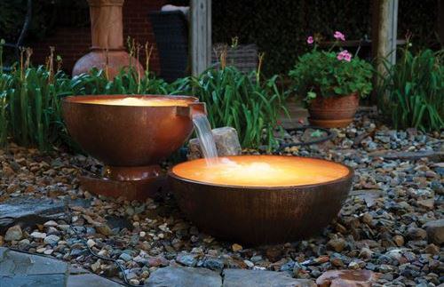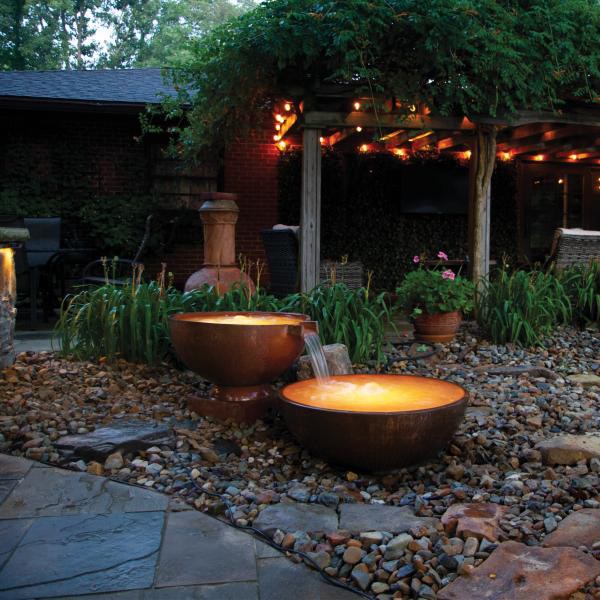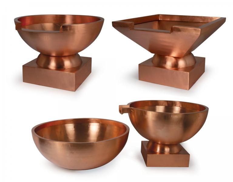 Tyto vysoce kvalitní fontánové nádoby vyrobené z elegantní mědi dodají jakékoliv zahradě speciální auru. Prvky mohou být použity samostatně nebo v kombinaci s volitelnou měděnou základnou vybranou na základě vašeho vkusu. K dispozici je řada různých designů nádob, od hranatých po kulaté, s výtoky nebo bez. Každá nádoba může být osvětlena zevnitř pomocí LED prstence. Teplota barvy 2 800 kelvinů dodává vodě třpytivý nádech. Měděné nádoby získají postupem času další aspekt vzhledu a kouzlo tím, jak se na tomto kovu vytváří patina.