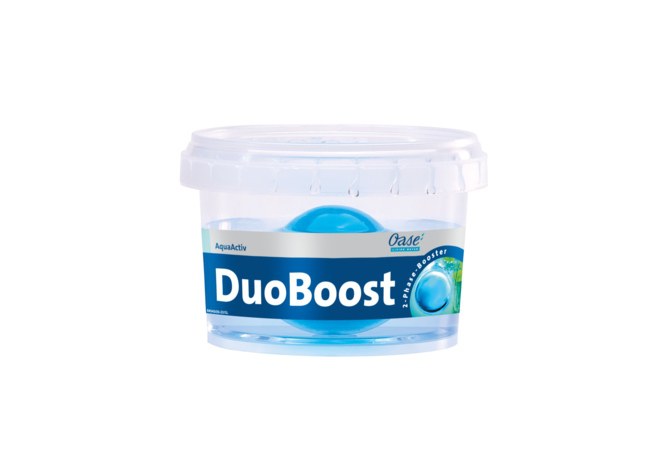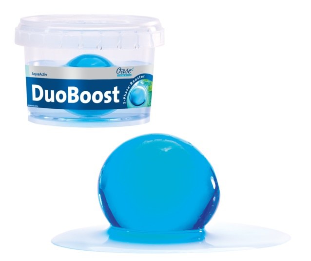 Oase AquaActiv DuoBoost je dvoufázový přípravek pro podporu zdravého biologického prostředí jezírka. První fázi působení tvoří vysoce aktivní tekutý gel obsahující enzymy a bakterie, který odbourává organické nečistoty, čpavek, dusitany a dusičnany. To také aktivuje bakterie filtru. Druhou fází tvoří kulička o velikosti 5cm. Ta se postupně rozpouští a uvolňují se důležité stopové prvky, kosubstráty, minerály a cenné přísady, které se jinak do umělého jezírka dostávají obtížně.