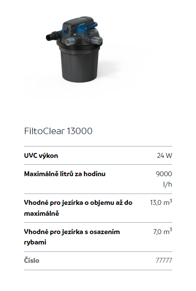 Upřesnění parametrů pro Oase FiltoClear 13000 (tlakový filtr+UV na 3m3)