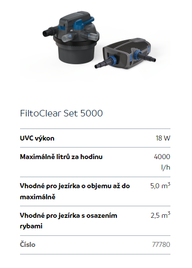 - Set obsahuje tlakový filtr Oase Filtoclear 5000 s UV lampou 18W, čerpadlo Oase Aquamax Eco Premium 5000 a startovací bakterie Oase BioKick CWS 100ml.