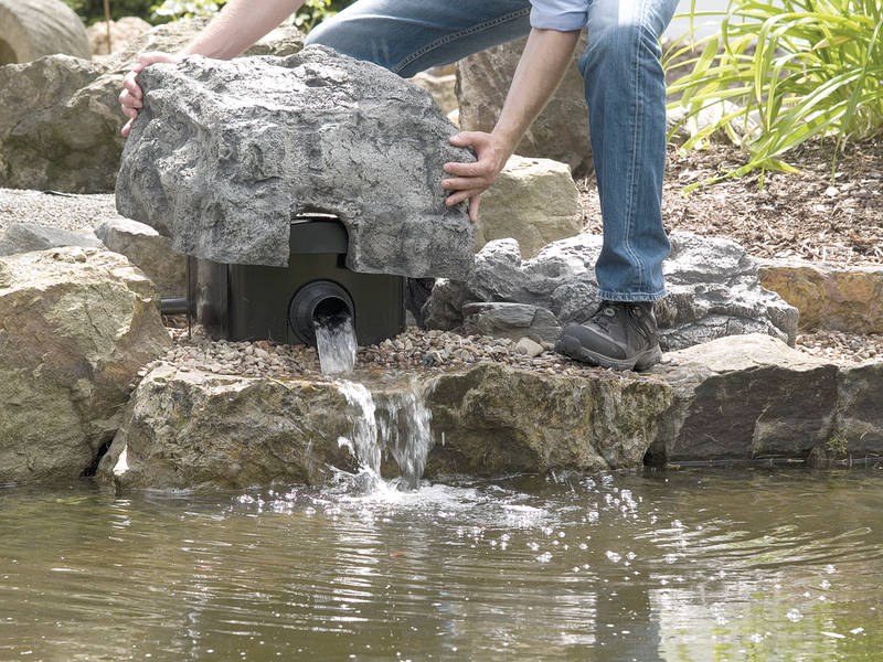 KAMUFLÁŽ: Zcela zakrývá technické filtrační hlavy a svým kamenným designem krásně zapadá do přirozeného prostředí krajiny kolem jezírka.
