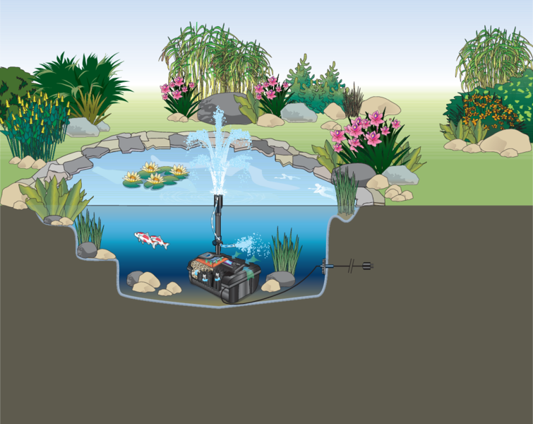 Podvodní filtr s UVC zařízením a vodní hrou.