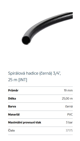 Spirálová hadice vyrobená z tlaku odolného PVC. Klesá rychle na dno a s délkou až 25 m je ideální pro budování jezírka. Díky své hladké vnitřní stěně optimalizované pro průtok zajistí malý odpor vody. Je odolná proti vlivům prostředí, jako je UV záření, a extrémním teplotám od -15 °C do +50 °C. Je zaručeno, že neobsahuje žádné těžké kovy a neznečišťuje flóru a faunu ve vodě.