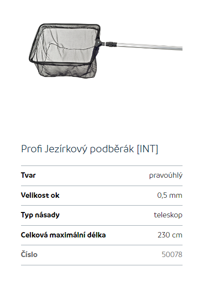Od snadného odstraňování drobných nečistot díky sítím s malými oky; pro odstraňování jemných řas a rostlinných zbytků a lov ryb, jejichž riziko poranění je minimalizováno díky jemné struktuře sítě: Podběráky jsou určeny pro snadnou manipulaci a odolnou kvalitu.