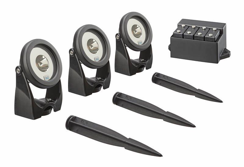 - Kompaktní sada 3 světel s robustním podvodním trafem, s krytím IP68 a bezpečnému napětí 24V trvale pod vodou (vhodné pro koupací jezírka).