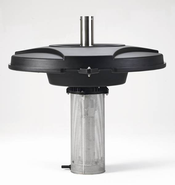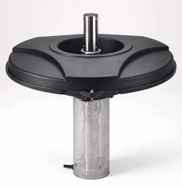 Plovoucí fontána pro větší vodní plochy s čerpadlem v ochranném nerezovém koši.