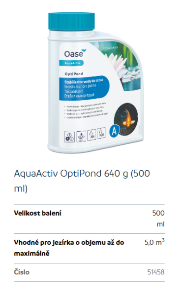 Upřesnění parametrů pro Oase OptiPond - ke stabilizaci vody po dešti (500ml na 5m3)