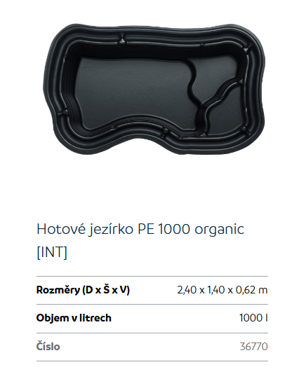 - Tato předem tvarovaná plastová jezírka do velikosti až 1 m3 usnadňují vybudování jezírka, protože hluboké a mělké části vodní plochy pro různé rostliny jsou již vytvořeny. Je také snadné do nich instalovat čerpadlo. Organicky tvarovaná jezírka obohatí každou zahradu a zajistí vám dlouhodobé potěšení, protože materiál je obzvláště odolný proti všem okolním vlivům, například proti prorůstání kořenů blízkých stromů.