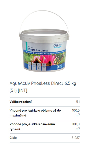Upřesnění parametrů pro Oase Phosless Direct - redukuje růst řas a potlačuje kalové plyny (5l na 100m3)