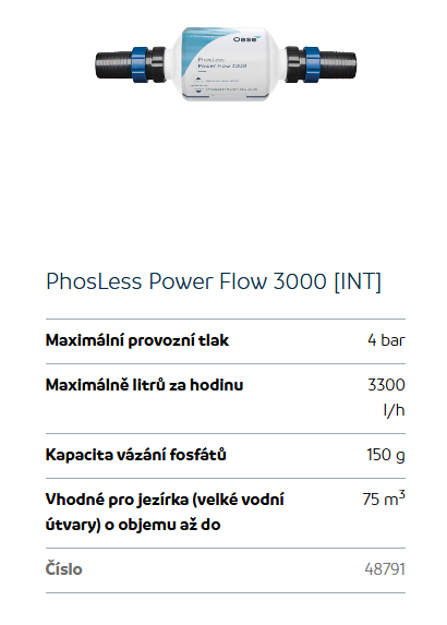 Upřesnění parametrů pro Oase PhosLess Power Flow 3000 (snížení fosfátů)