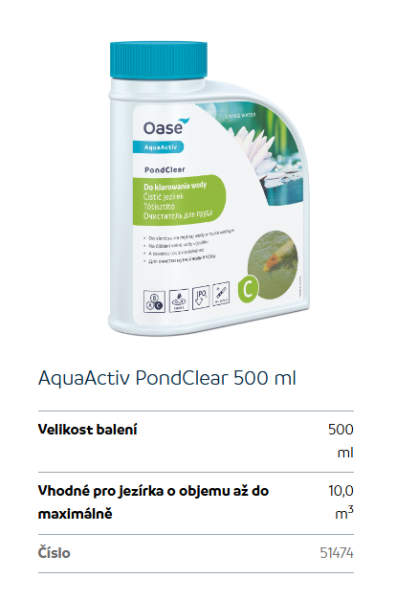 Upřesnění parametrů pro Oase PondClear - odstraňuje zelenou/zakalenou vodu (500ml na 10m3)