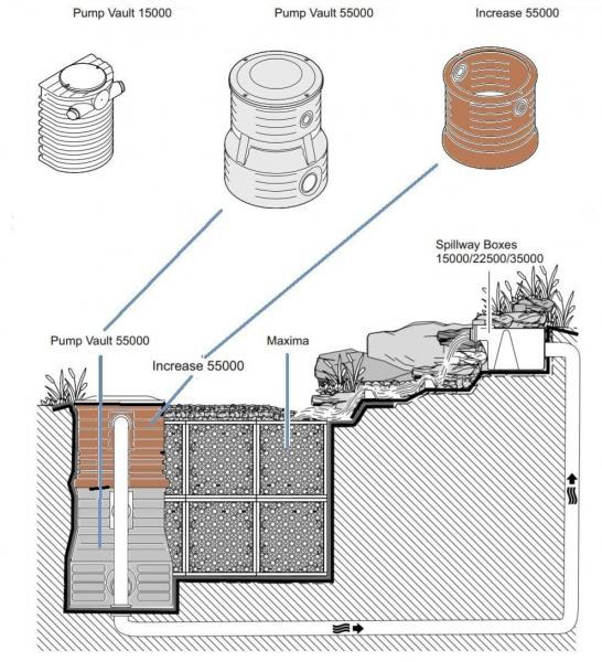 - Extrémně stabilní modulární maticové bloky Maxima pro výrobu individuálních skrytých zásobníků vody, umístěných pod zemí ve fóliových nádržích, čímž umožňují zadržování velkého množství vody na velmi malém prostoru. Ideální také pro zakládání záchytných jímek, čisticích stanic nebo rostlinných filtrů pod zelenými plochami. K dispozici jsou čerpací komory různých velikostí, které jsou vhodné pro systém snadné údržby a pro bezpečné umístění čerpadla. Pro bezpečné umístění a optimální vedení kabelů a hadic lze na vyvýšeniny Eco-Rise umístit vodní prvky bez stojanů nebo základen, jako jsou kameny u pramenišť nebo elegantní měděné misky OASE.