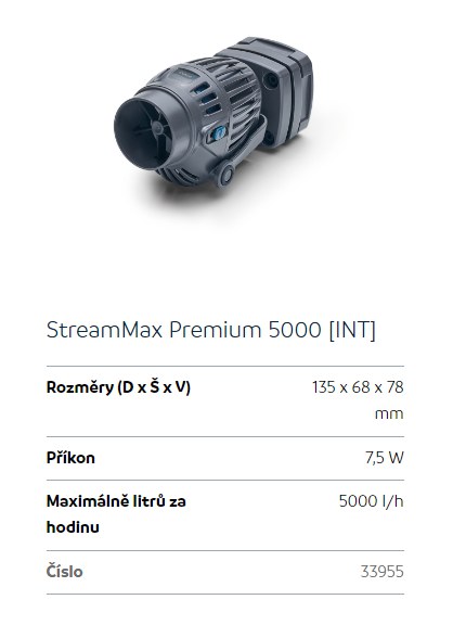- Proudové čerpadlo s nízkou spotřebou elektřiny a mimořádně vysokým výkonem je vhodné pro sladkovodní i mořská akvária. Vytváří přirozený pohyb vody s nastavitelným průtokovým množstvím podle potřeb zvířat a rostlin. Až dvě z těchto čerpadel lze ovládat pomocí řadiče Pump Controller a flexibilně je nastavovat podle individuálních potřeb obyvatel akvária. Čerpadla obsahují silný magnetický držák, který spolehlivě drží StreamMax Premium na svém místě. Jejich provoz je nenáročný na údržbu, energeticky velmi úsporný a tichý. Čerpadlo StreamMax má kompaktní provedení. S volitelným řadičem Aquarium Controller lze čerpadla ovládat i přes aplikaci.