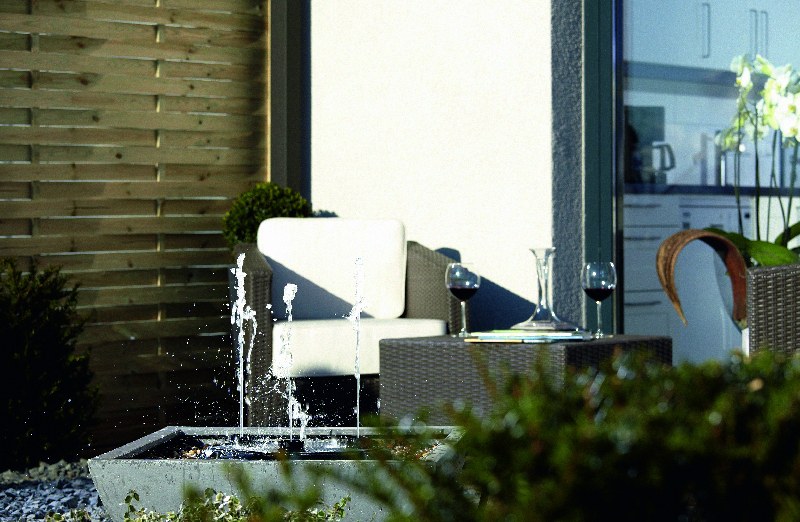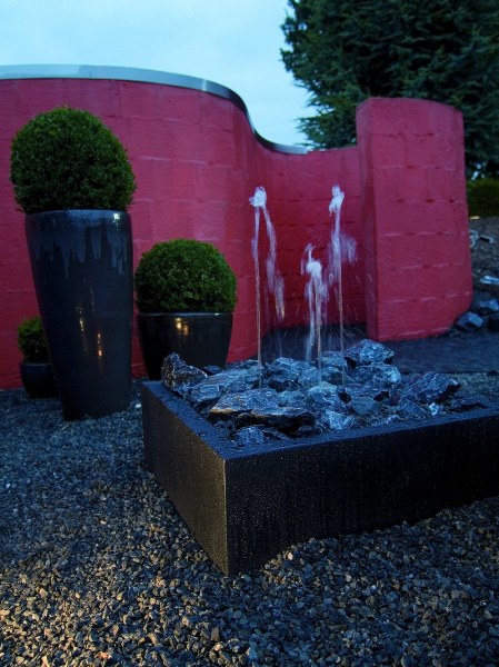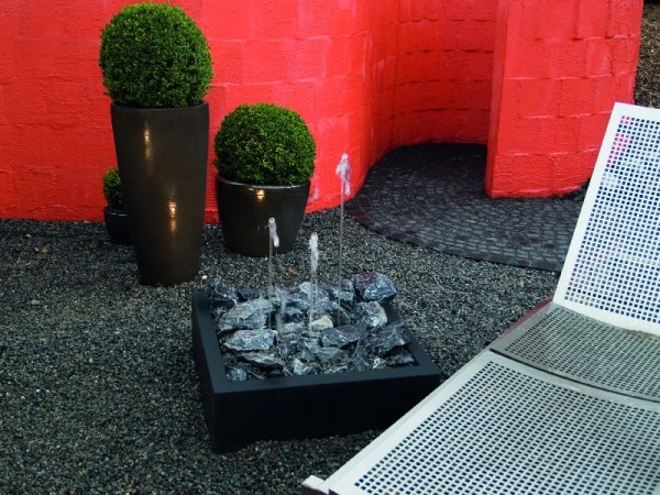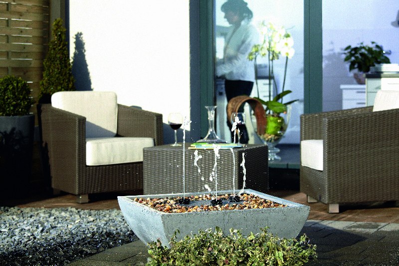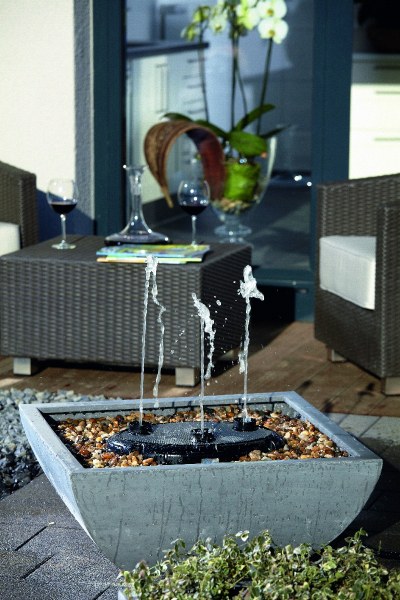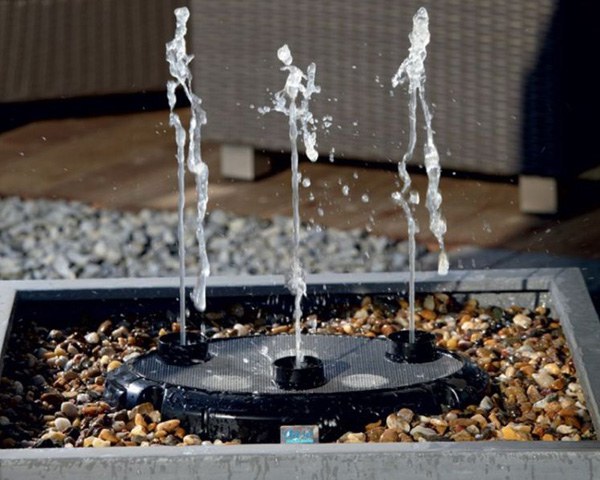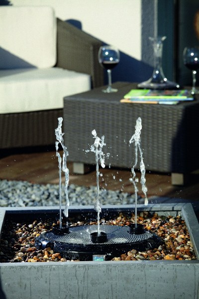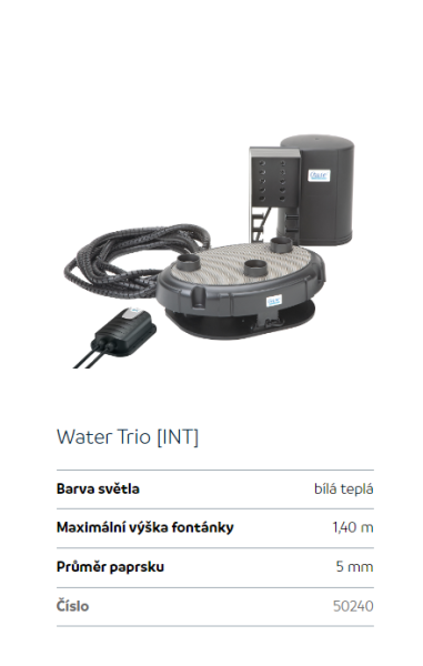 - Elegantní vodní prvek Water Trio je vizuálním potěšením se svými třemi fontánami zalitými v oslnivém světle, díky osvětlení, které je součástí dodávky. Výšky trysek fontány můžete měnit od 30 do 140 cm s proměnlivou intenzitou světla. Tyto vlastnosti jsou předem naprogramovány a lze je snadno navolit pomocí dálkového ovladače na vzdálenost až 80 m. Robustní základová deska poskytuje ochranu před poškozením a umožňuje instalaci na širokou škálu povrchů. Díky našemu konceptu plug-and-spray je instalace snadná a bezproblémová. Bezpečná 12V technologie může být také použita v koupacích jezírkách.