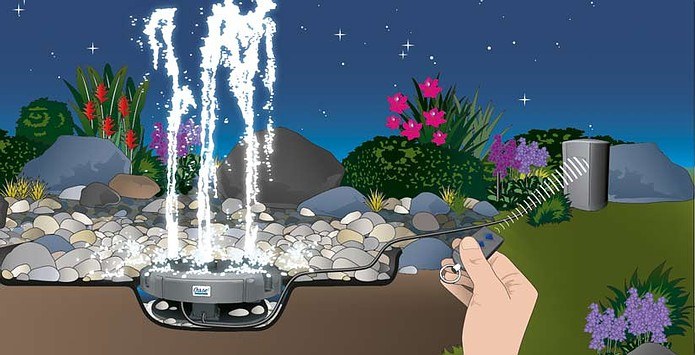 - Různé a pevně nastavené programy lze pohodlně vybírat na dálkovém ovládání až ze vzdálenosti 80m. Programy zahrnují: variace výšky fontánky, rychlosti a intenzity LED světelných kroužků.