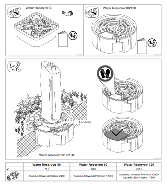 Neviditelná nádrž, mimořádně pevná základna pro instalaci vodního prvku bez jezírka. Konstrukce je rychlá a jednoduchá. Prostorově úsporné provedení je tudíž ideální pro zahradu nebo terasu. Díky drážkám na horní straně mohou být hadice uloženy bez překážek a bez zalomení. Přístup k čerpadlu umožňuje snadnou údržbu. Vysoké užitečné zatížení umožňuje vodní prvky s více vyvěracími kameny nebo těžkými kameny.