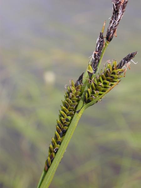 Popis: Vytrvalá, řídce trsnatá, 10 až 90 cm vysoká bylina. Lodyha je přímá, tuhá, ostře trojhranná, v horní části drsná, pouze dole olistěná. Listy jsou tuhé, šedozelené, na okraji drsné, 2 až 5 mm široké, kratší nebo stejně dlouhé jako lodyhy. Květenství je přímé, horní 1 nebo 2 klásky jsou složeny ze samčích květů, dolní 2 až 4 klásky z květů samičích, spodní listen je podobný listům a je kratší než květenství. Samčí květy mají nejčastěji 3 tyčinky, samičí 2 blizny. Mošničky jsou zprvu zelené, za zralosti hnědé až černé, asi 2 až 4 mm dlouhé, na vnější straně vyduté a na vnitřní straně ploché, na vrcholu prodloužené v krátký a nerozeklaný zobánek. Plevy jsou černé se zeleným kýlem a jsou kratší než mošničky. Kvete v V až VII.