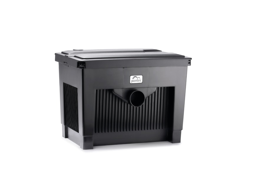 Výkonný průtokový filtr pro zahradní jezírka a jezírka s rybami o velikosti 4,5m3. Kombinace filtrační pěny a integrovaného čističe UVC zajišťuje nejlepší výkonnost filtrace: Různé filtrační pěny zajišťují optimální mechanickou a biologickou filtraci. Pro čištění má průtokový filtr páky pro stlačení nečistot z filtračních pěn, spodní odtok a připojení pro výplach.