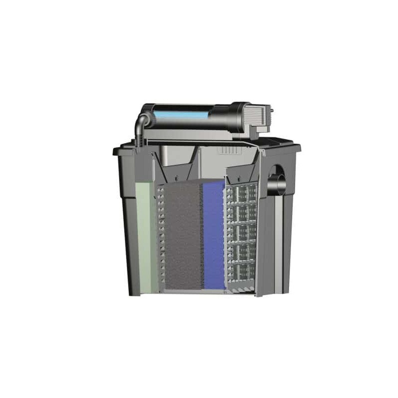- Průtokový filtr s UV lampou pro zahradní jezírka a jezírka s rybami o velikosti 3,5m3. Kombinace filtrační pěny a integrované UVC lampy zajišťuje nejlepší výkonnost filtrace. Různé filtrační pěny zajišťují optimální mechanickou a biologickou filtraci.
