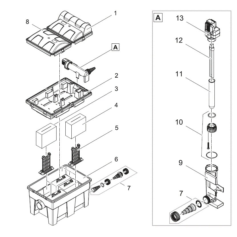 - Připravený k připojení a kompletní. Tento kompaktní průtokový filtr zajišťuje zaručeně průzračně čistou, zdravou a čistou vodu ve Vašem jezírku. Integrované UVC čisticí zařízení účinně eliminuje výskyt rozptýlených řas a zakalení vody.