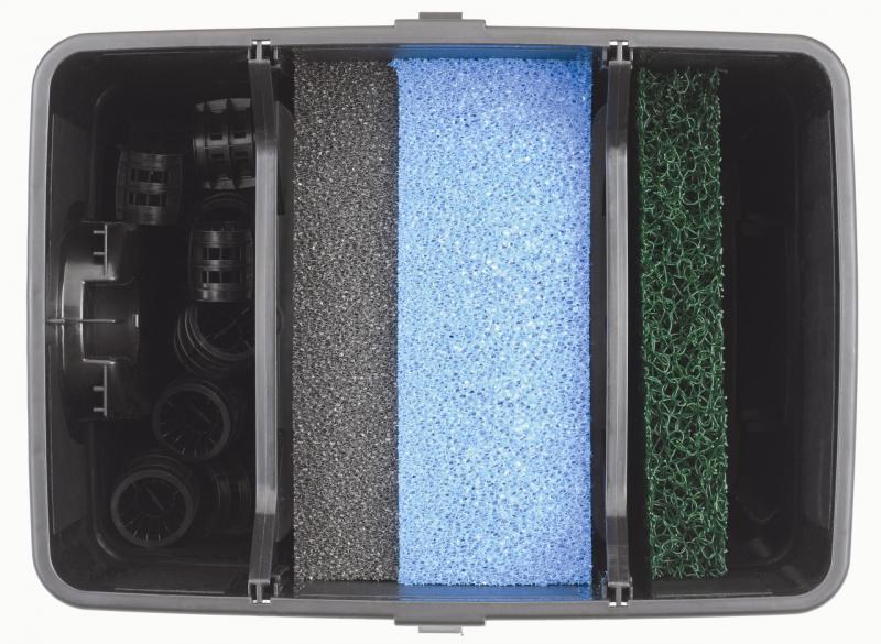 - 4 různá filtrační média vícekomorového filtru - japonská filtrační rohož, houba s hrubým a jemným filtrem a prvek s biopovrchem - stejně jako 2 dělící stěny regulující průtok jsou v tomto ohledu podporou!