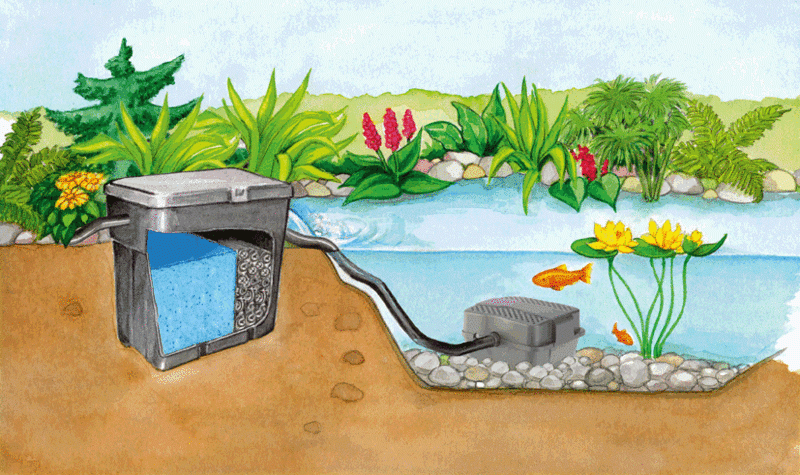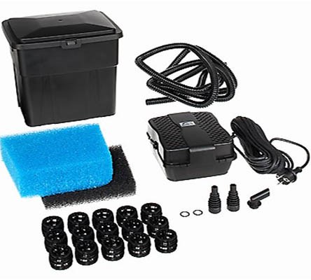 - Vícestupňový filtrační systém s různými filtračními stupni (filtrační houby a bioelementy).