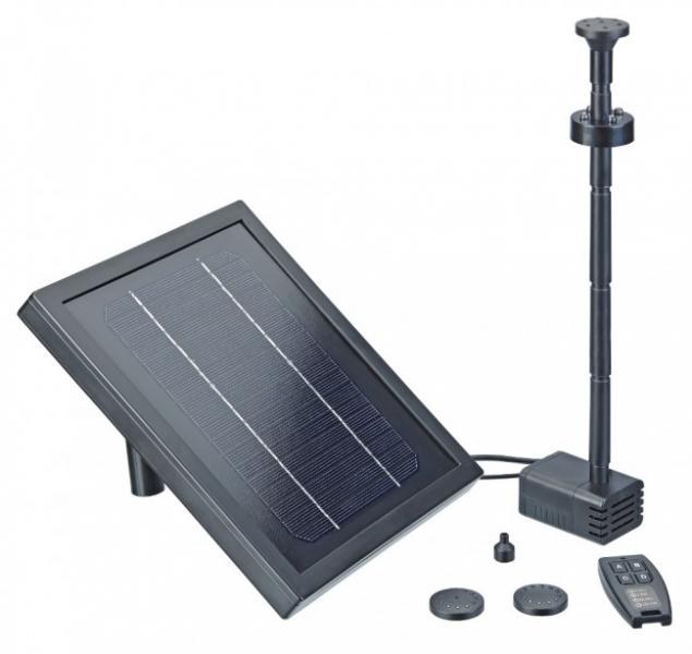 • Sada obsahuje: fontánové čerpadlo 250 l/hod., solární panel 3W / 9V, LED osvětlení, komfortní dálkové ovládání a 4 fontánové trysky pro různé efekty.
