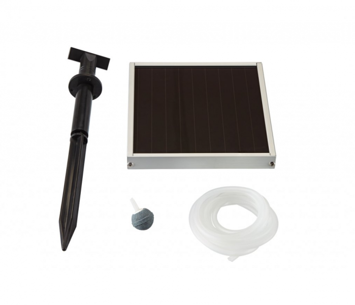 • Ve výbavě naleznete dvoumetrovou vzduchovou hadici, vzduchovací kámen, solární modul, kolík pro ukotvení, vzduchovací čerpadlo.