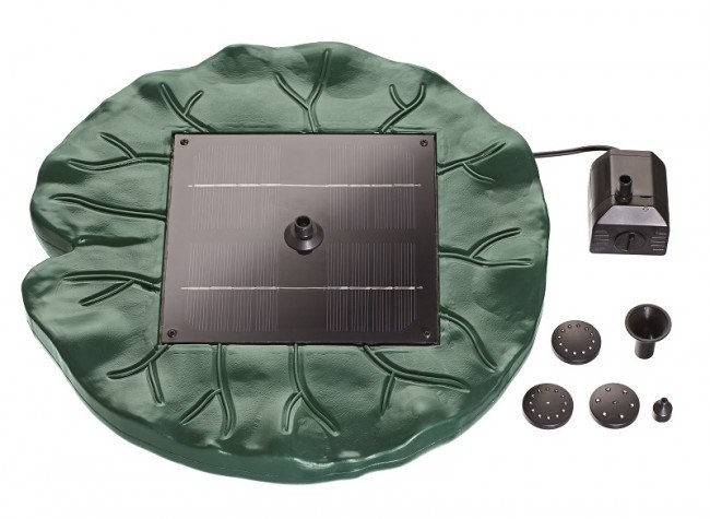 - Sada obsahuje: fontánové čerpadlo 6V s výkonem 150 l/hod, solární panel o výkonu 1,4 W. 4 výměnné trysky.