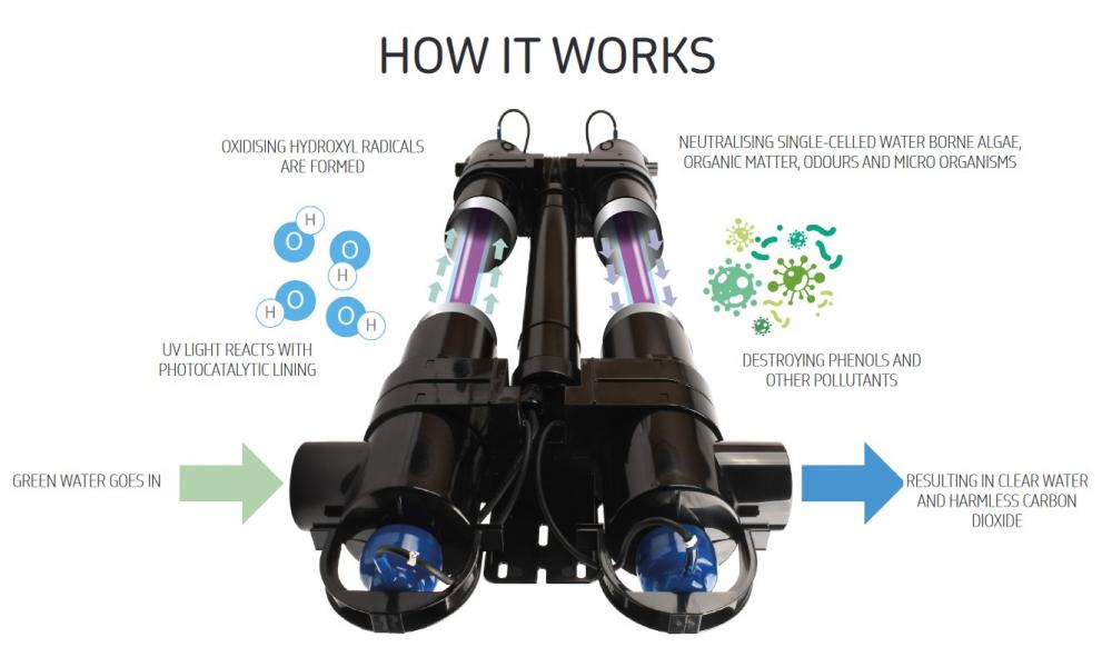 - Voda je čištěna pomocí krátkovlnného ultrafialového záření typu c (UV-C) - mimo jednobuněčné řasy, zabraňuje množení pro ryby nebezpečných jednobuněčných mikroorganismů (různých druhů bakterií, plísní a virů).