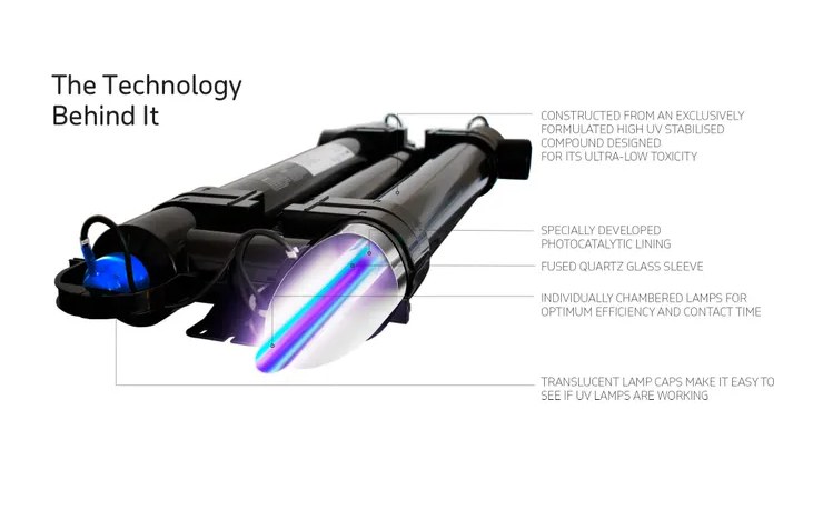 - Speciální vnitřní obložení těchto UV-C jednotek působí jako katalyzátor přeměny UV-C světla na hydroxylové radikály.