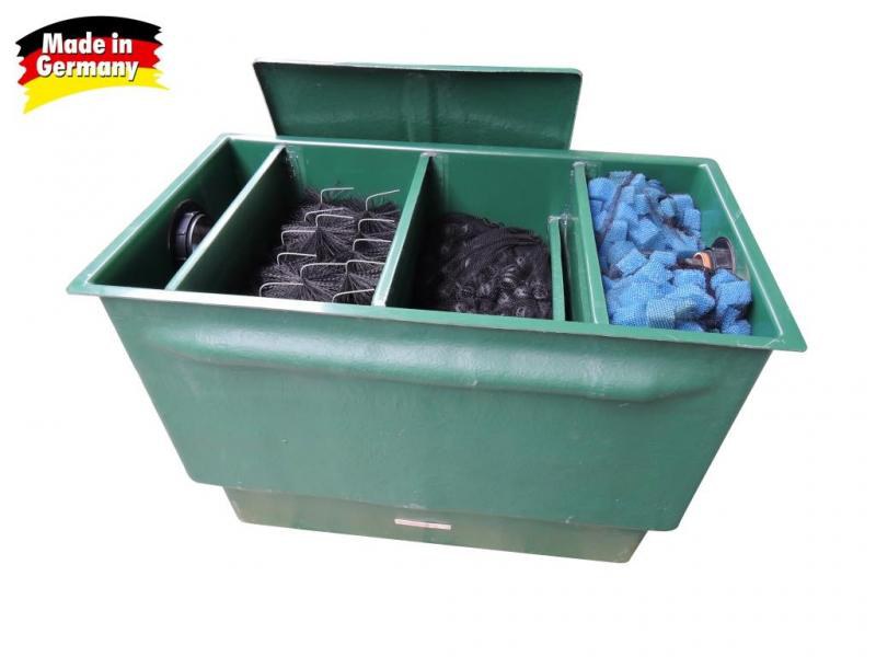 Kvalitní a profesionální filtr pro jezírka od firmy Tripond. Konkurenční výrobky mají nepoměrně menší velikost, i když výrobce uvádí stejný filtrační výkon, až časem se projeví funkčnost filtru a čistota jezírka. Nejdůležitější je biologická část, filtrační plocha pro usídlení filtračních bakterií, s tím souvisí čistota vody v jezírku. U menších filtrů dochází k neustálému ucpávání filtračních médií, filtr začne přetékat. Ideální stav je mít filtr předimenzovaný a ušetřit si čas s neustálým čistěním filtru. Další důležitou částí ve filtru je tzv. mechanická, která zbavuje vodu všech hrubších nečistot před vstupem do biologické části jezírkového filtru. Nepostradatelnou součástí filtru je odkalování všech komor, která mají vyspádovaná dna, proto se odkalují bezezbytku.