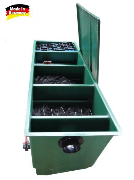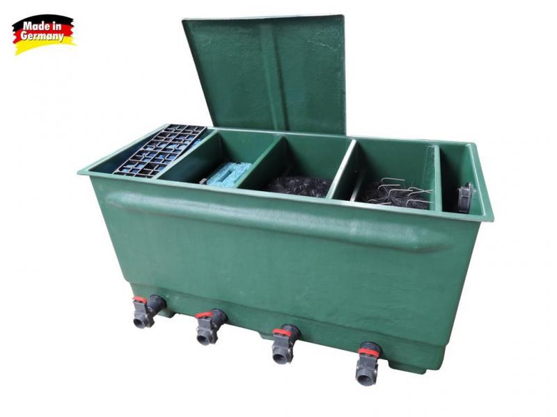 Kvalitní a profesionální filtr pro jezírka od firmy Tripond. Konkurenční výrobky mají nepoměrně menší velikost, i když výrobce uvádí stejný filtrační výkon, až časem se projeví funkčnost filtru a čistota jezírka. Nejdůležitější je biologická část, filtrační plocha pro usídlení filtračních bakterií s tím souvisí čistota vody v jezírku. U menších filtrů dochází k neustálému ucpávání filtračních médií, filtr začne přetékat. Ideální stav je mít filtr předimenzovaný a ušetřit si čas s neustálým čistěním filtru. Další důležitou částí ve filtru je tzv. mechanická, která zbavuje vodu všech hrubších nečistot před vstupem do biologické části jezírkového filtru. Nepostradatelnou součástí filtru je odkalování všech komor, která mají vyspádovaná dna, proto se odkalují bezezbytku.