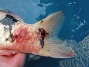 Krvavé rány a vředy na těle ryb, zarudlé fleky na kůži, odstávání šupin, rozpad ploutví. Vždy doporučujeme nejdříve vyšetření veterinárním lékařem.