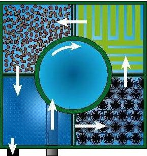Kvalitní a profesionální filtr pro jezírka od firmy Tripond s označením Center Vortex C-20 až C-115. Konkurenční výrobky mají nepoměrně menší velikost, i když výrobce uvádí stejný filtrační výkon, až časem se projeví funkčnost filtru a čistota jezírka. Nejdůležitější je biologická část, filtrační plocha pro usídlení filtračních bakterií s tím souvisí čistota vody v jezírku. U menších filtrů dochází k neustálému ucpávání filtračních médií, filtr začne přetékat. Ideální stav je mít filtr předimenzovaný a ušetřit si čas s neustálým čistěním filtru. Další důležitou částí ve filtru je tzv. mechanická, která zbavuje vodu všech hrubších nečistot před vstupem do biologické části jezírkového filtru. U tohoto filtru je to vortexová komora (tzv. odstředivka), ve které vy sedimentují všechny těžší částice, protože vstup do komory je níže než přepad do další komory. Nepostradatelnou součástí filtru je odkalování všech komor, která mají vy spádovaná dna, proto se odkalují bezezbytku.