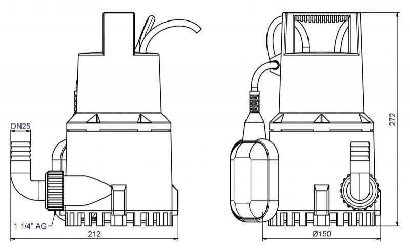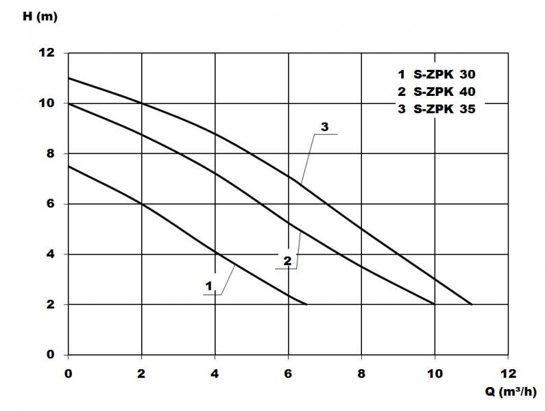 - Čerpadlo s 10m kabelu s vidlicí, výtlačné koleno 90° (S-ZPK 30: DN 25; S-ZPK 35 a S-ZPK 40: DN 32).